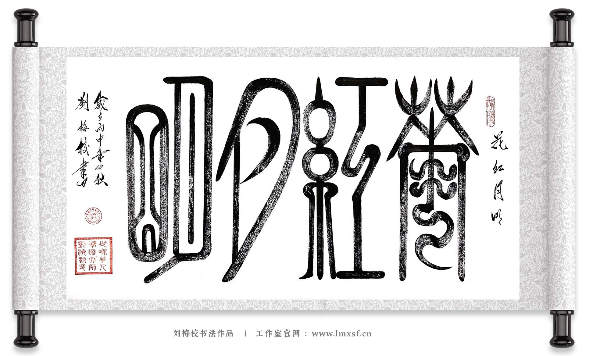 刘梅校以创新篆体勾勒 “花红月明” 四字,篆笔婉转如月光流泻,笔画间既有金文的古朴厚重,又融入现代审美对线条的灵动处理 ——“花” 字线条柔美似花瓣舒展,“月” 字圆润如中秋玉盘,“红” 与 “明” 二字则透着暖意,仿佛能看见月下红花绽放的烂漫景致。这幅作品将中秋 “花好月圆” 的经典意象凝于笔墨,既是对传统佳节的致敬,也以创新篆法赋予 “花红月明” 新的艺术生命力,让观者在笔墨间感受中秋的静谧与温馨。