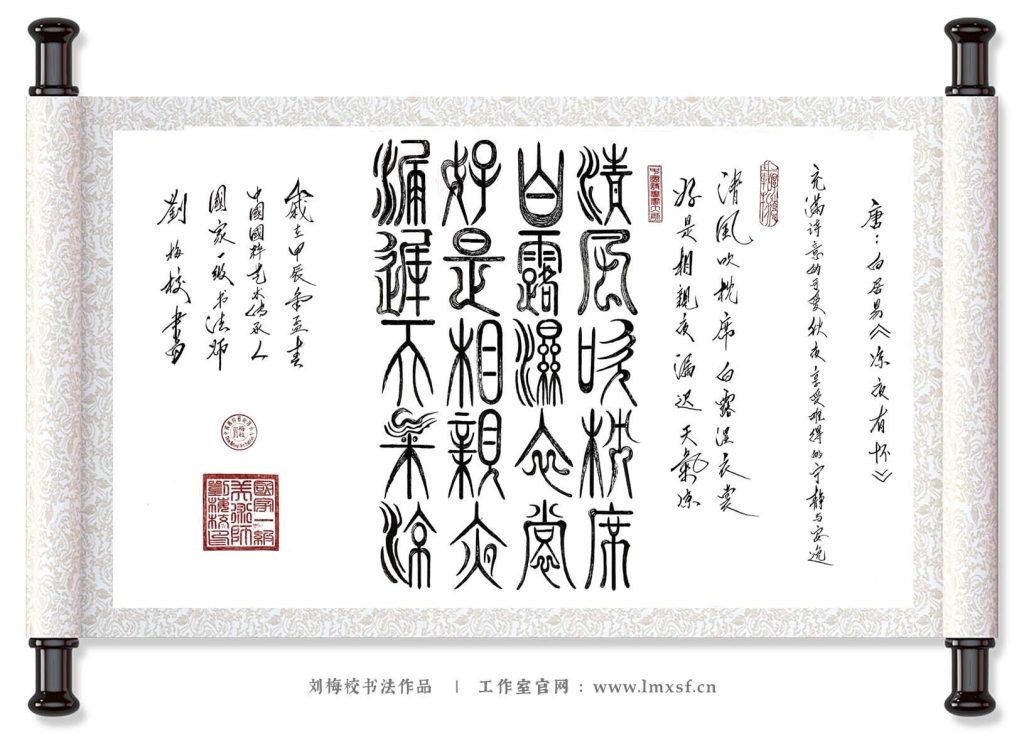 刘梅校以原创新篆书写白居易《凉夜有怀》,将秋日凉夜的清幽与诗人的怀思细腻呈现。篆体线条在此处多了几分清雅:横画如秋夜的微风,竖画似庭前的疏竹,笔画间的留白恰到好处,透着 “凉夜” 的静谧。诗中 “清风吹枕席,白露湿衣裳” 的意境,被转化为笔墨的温润 —— 没有浓墨重彩,却以淡墨轻描勾勒出秋夜的清爽,让观者在品读篆体诗句时,既能感受白居易诗中的闲淡情怀,也能体会创新篆法带来的雅致韵味,仿佛置身中秋凉夜,与诗人共赏一轮明月。