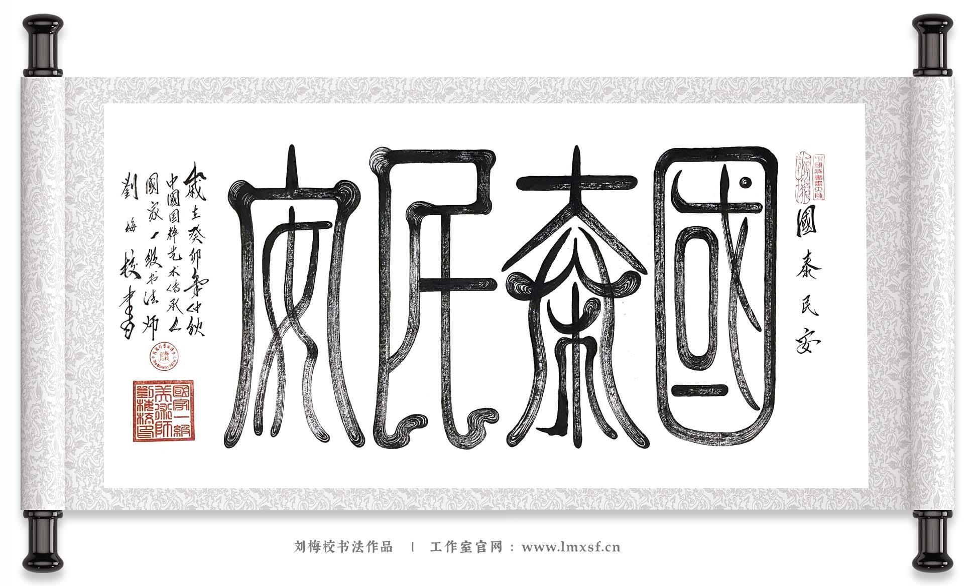《国泰民安》是刘梅校献给国庆的赤诚之作。与中秋作品的柔美不同,这幅作品的篆体线条充满力量感:“国” 字笔画厚重如山河稳固,方框结构似疆域辽阔,透着大国的庄严;“泰” 字线条舒展,似百姓安居乐业的从容;“民” 字笔画温润,藏着对民生的关切;“安” 字圆润饱满,如国泰民安的祥和图景。刘梅校以创新篆法将 “国泰民安” 四字的内涵具象化 —— 没有多余修饰,却以铁画银钩的笔力,写出了 2023 年国庆佳节里,各族人民修复灾害创伤、加速发展经济的坚韧,也写出了对祖国 “国运永昌、繁荣富强” 的美好祈愿,笔墨间满是对伟大祖国的热爱与祝福。